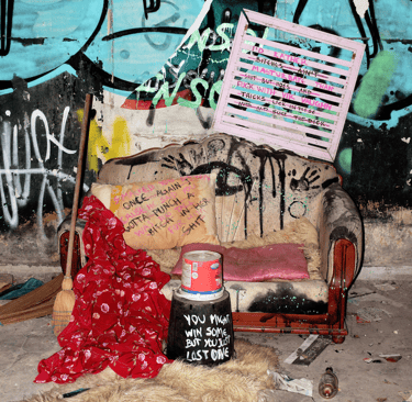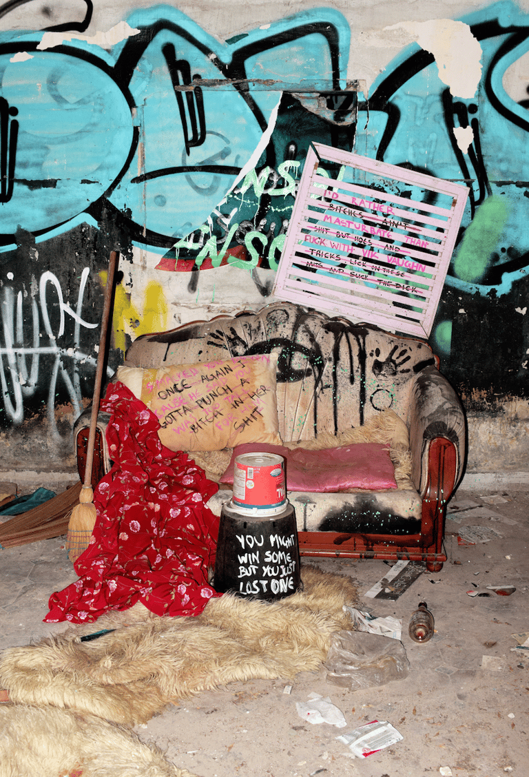 "Straight outta Her" is part of a project where creative interventions were made on abandoned buildings and were left there for future visitors. This series of installations aims to comment on the objectification of women in Hip Hop music and the position of women on the contemporary society.